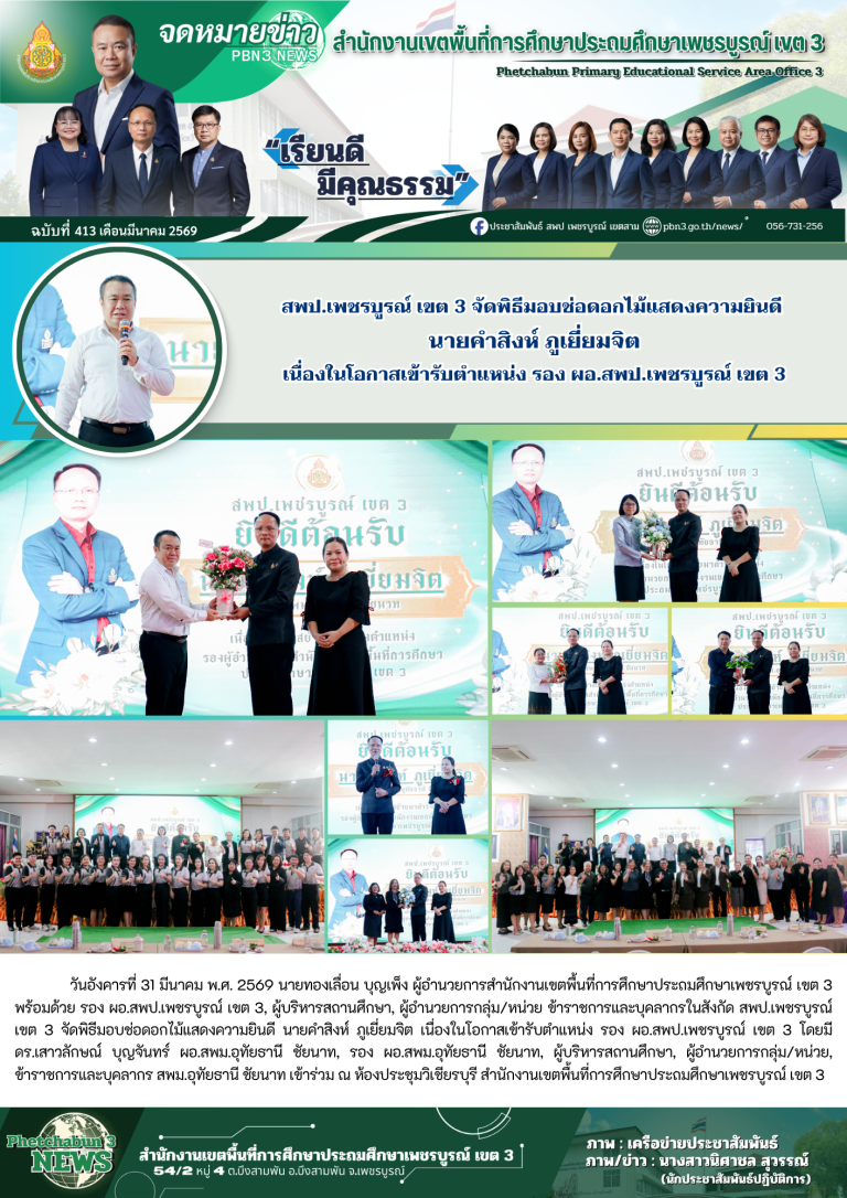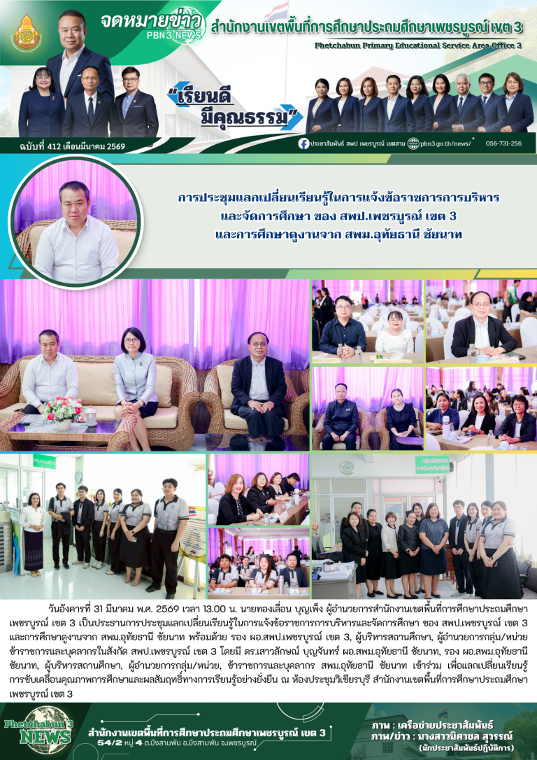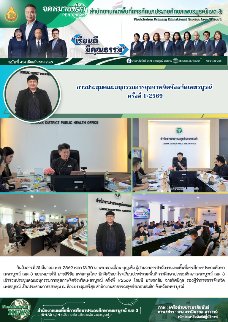 วันพุธที่ 24 พฤศจิกายน พ.ศ.2564 (เวลา 08.00 – 10.00 น.) นายรพีพงศ์ วรวัฒน์ธนากุล ผู้อำนวยสำนักงานเขตพื้นที่การศึกษาประถมศึกษาเพชรบูรณ์ เขต 3 เป็นประธานรับชมรายการ “พุธเช้า ข่าวสพฐ.” ครั้งที่ 44/2564 และประชุมเสวนาสภากาแฟ พร้อมด้วย รอง ผอ.สพป.เพชรบูรณ์ เขต 3 ผู้อำนวยการกลุ่ม และบุคลากรทางการศึกษา เข้าร่วม เพื่อติดตามข่าวสาร นโยบายการจัดการศึกษาสู่การปฏิบัติจาก สพฐ. รับทราบผลการดำเนินงานของกลุ่มงานต่าง ๆ ปัญหา แนวทางการดำเนินงานฯ และ หารือข้อราชการที่สำคัญ กับทีมบริหารฯ ณ ห้องประชุมหนองไผ่ สำนักงานเขตพื้นที่การศึกษาประถมศึกษาเพชรบูรณ์ เขต 3