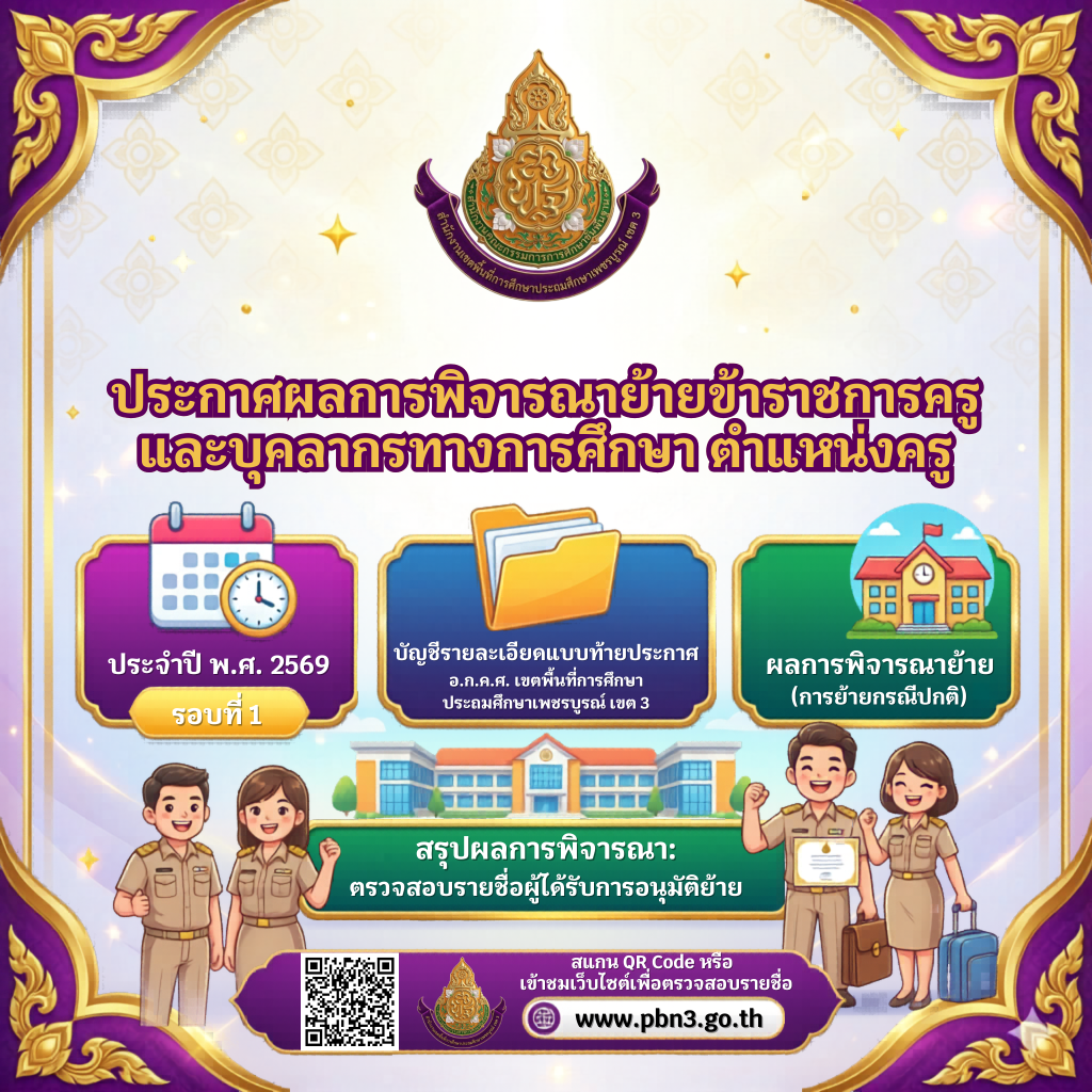 ผลการพิจารณาย้ายข้าราชการครูและบุคลากรทางการศึกษา ตำแหน่งครู (การย้ายกรณีปกติ)ประจำปี พ.ศ. 2569 รอบที่ 1 สังกัดสำนักงานเขตพื้นที่การศึกษาประถมศึกษาเพชรบูรณ์ เขต 3 job 01 Apr 2026 119 share tweet share +ประกาศ ย้ายครู 2569 รอบที่1 สพป.เพชรบูรณ์ เขต 3+Download