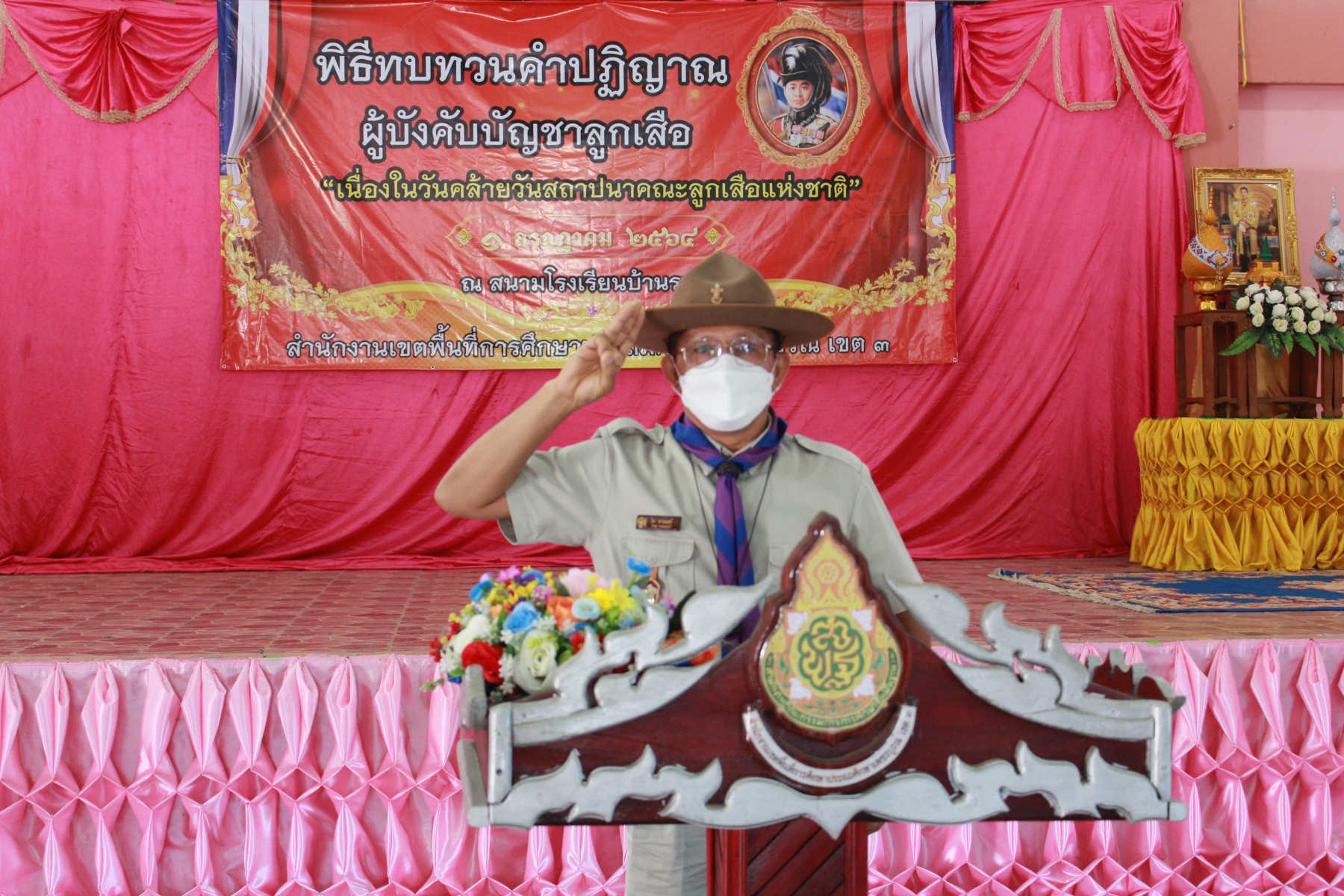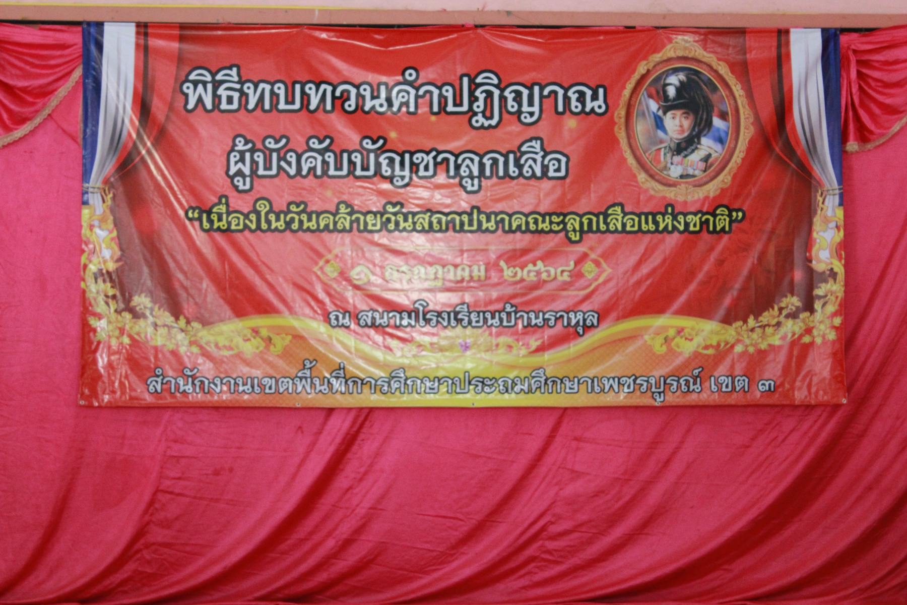 วันพฤหัสบดีที่ 1 กรกฎาคม พ.ศ. 2564 เวลา 09.00 น. ดร.ไท พานนนท์ ผู้อำนวยการสำนักงานเขตพื้นที่การศึกษาประถมศึกษาเพชรบูรณ์ เขต 3 เป็นประธานในพิธีทบทวนคำปฏิญาณผู้บังคับบัญชาลูกเสือ เนื่องในวันสถาปนาคณะลูกเสือแห่งชาติ ประจำปี 2564 โดยมีคณะกรรมการลูกเสือเขตพื้นที่การศึกษาเพชรบูรณ์ เขต 3 ผู้ทรงคุณวุฒิ ผู้กำกับลูกเสือ และบุคลากรทางการลูกเสือ เข้าร่วมพิธี เพื่อน้อมรำลึกในพระมหากรุณาธิคุณพระบาทสมเด็จพระมงกุฎเกล้าเจ้าอยู่หัว พระผู้พระราชทานกำเนิดลูกเสือไทยและแสดงความจงรักภักดีสมเด็จพระเจ้าอยู่หัวประมุขของคณะลูกเสือแห่งชาติ ณ หอประชุมโรงเรียนบ้านราหุล อำเภอบึงสามพัน จังหวัดเพชรบูรณ์