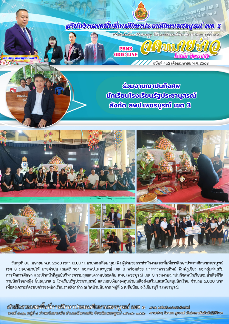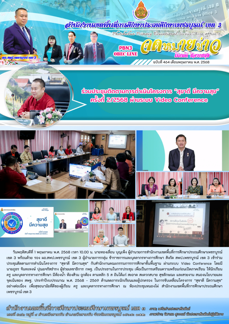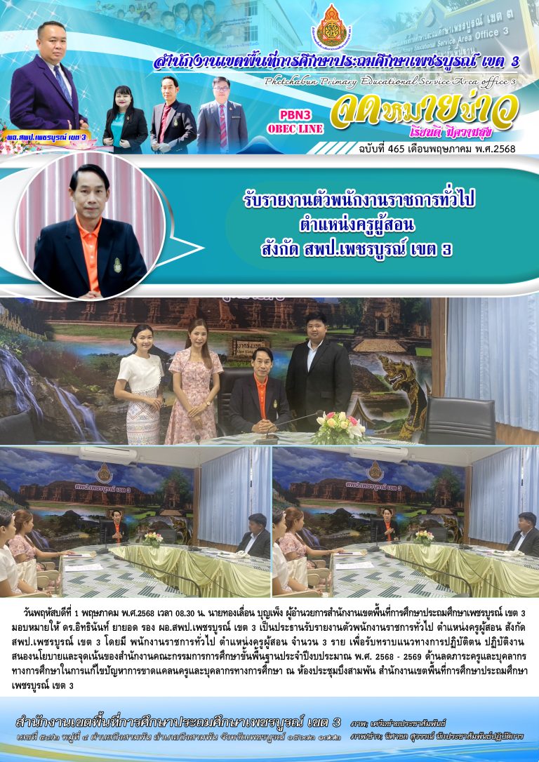 วันอังคารที่ 6 พฤษภาคม พ.ศ. 2568 เวลา 07.30 น. นายทองเลื่อน บุญเพ็ง ผู้อำนวยการสำนักงานเขตพื้นที่การศึกษาประถมศึกษาเพชรบูรณ์ เขต 3 มอบหมายให้ นายคำปุน เสนศรี รอง ผอ.สพป.เพชรบูรณ์ เขต 3 ร่วมรับชมพิธีเปิด ความร่วมมือและปฏิบัติการตรวจร่วม “นักเรียนปลอดภัย ห่างไกลบุหรี่ไฟฟ้าและยาเสพติด” ระหว่างกระทรวงศึกษาธิการ กระทรวงมหาดไทย และสำนักงานตำรวจแห่งชาติ โดยมี นายกกชัย ฉายรัศมีกุล รองผู้ว่าราชการจังหวัดเพ
