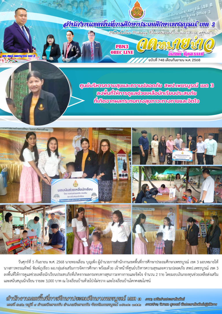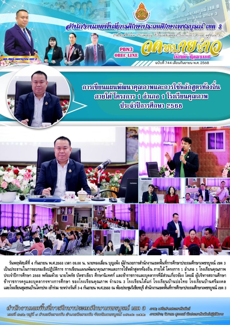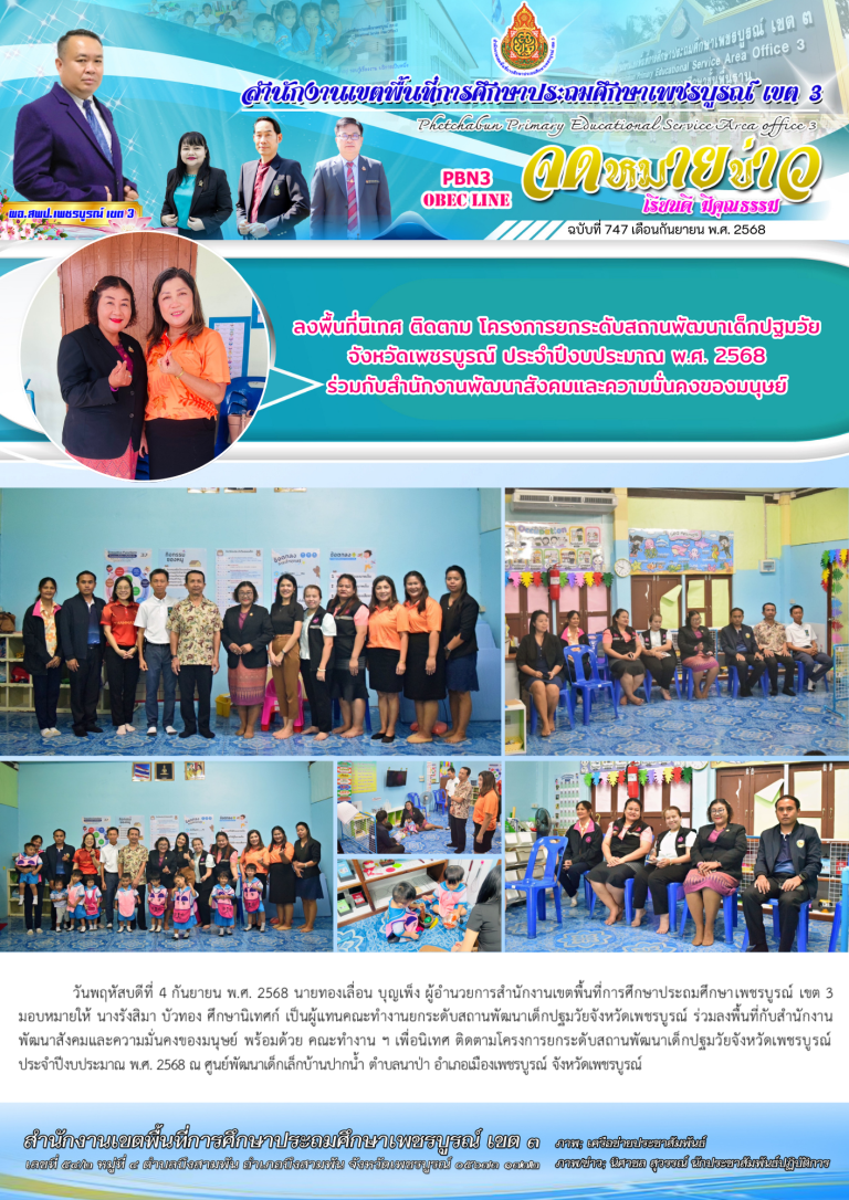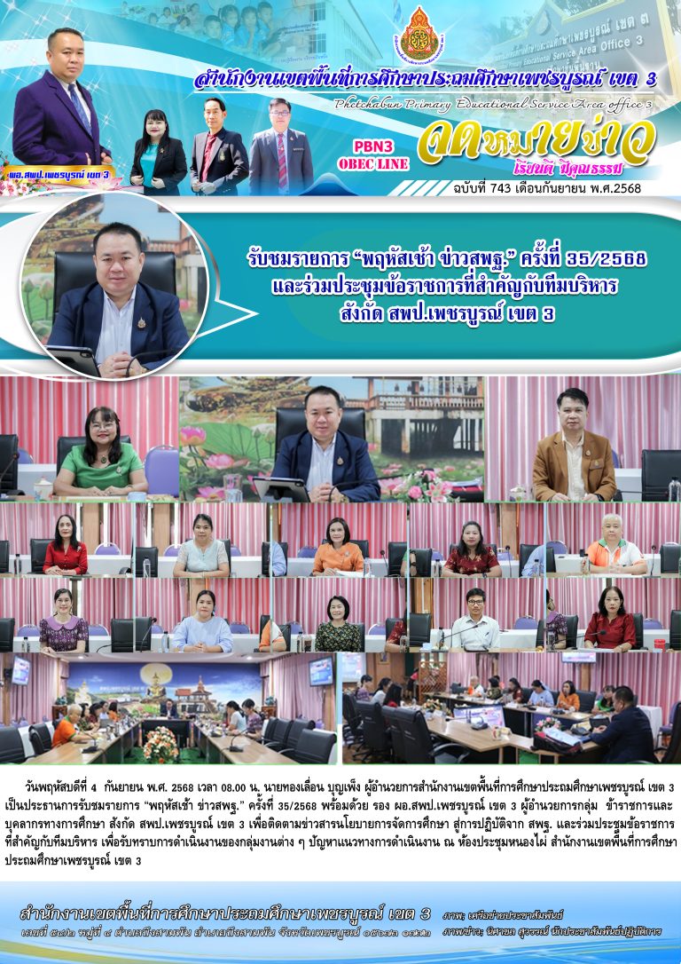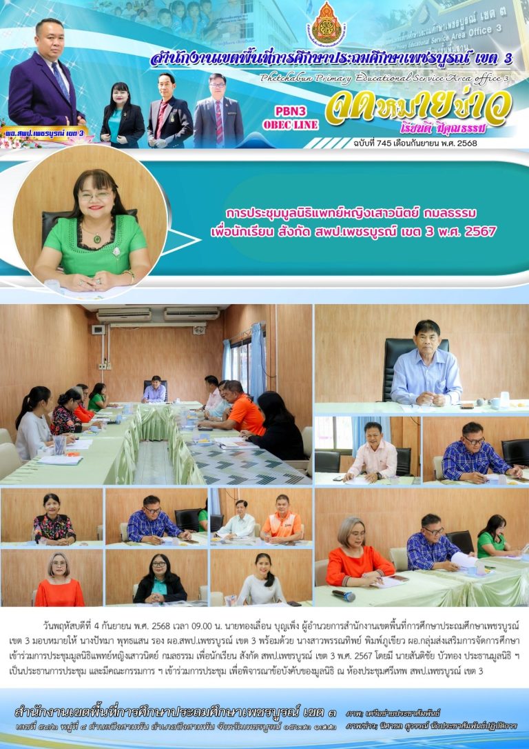 วันพฤหัสบดีที่ 4 กันยายน พ.ศ. 2568 เวลา 09.00 น. นายทองเลื่อน บุญเพ็ง ผู้อำนวยการสำนักงานเขตพื้นที่การศึกษาประถมศึกษาเพชรบูรณ์ เขต 3 มอบหมายให้ นางปัทมา พุทธแสน รอง ผอ.สพป.เพชรบูรณ์ เขต 3 พร้อมด้วย นางสาวพรรณทิพย์ พิมพ์ภูเขียว ผอ.กลุ่มส่งเสริมการจัดการศึกษา เข้าร่วมการประชุมมูลนิธิแพทย์หญิงเสาวนิตย์ กมลธรรม เพื่อนักเรียน สังกัด สพป.เพชรบูรณ์ เขต 3 พ.ศ. 2567 โดยมี นายสันติชัย บัวทอง ประธานมูลนิธิ ฯ