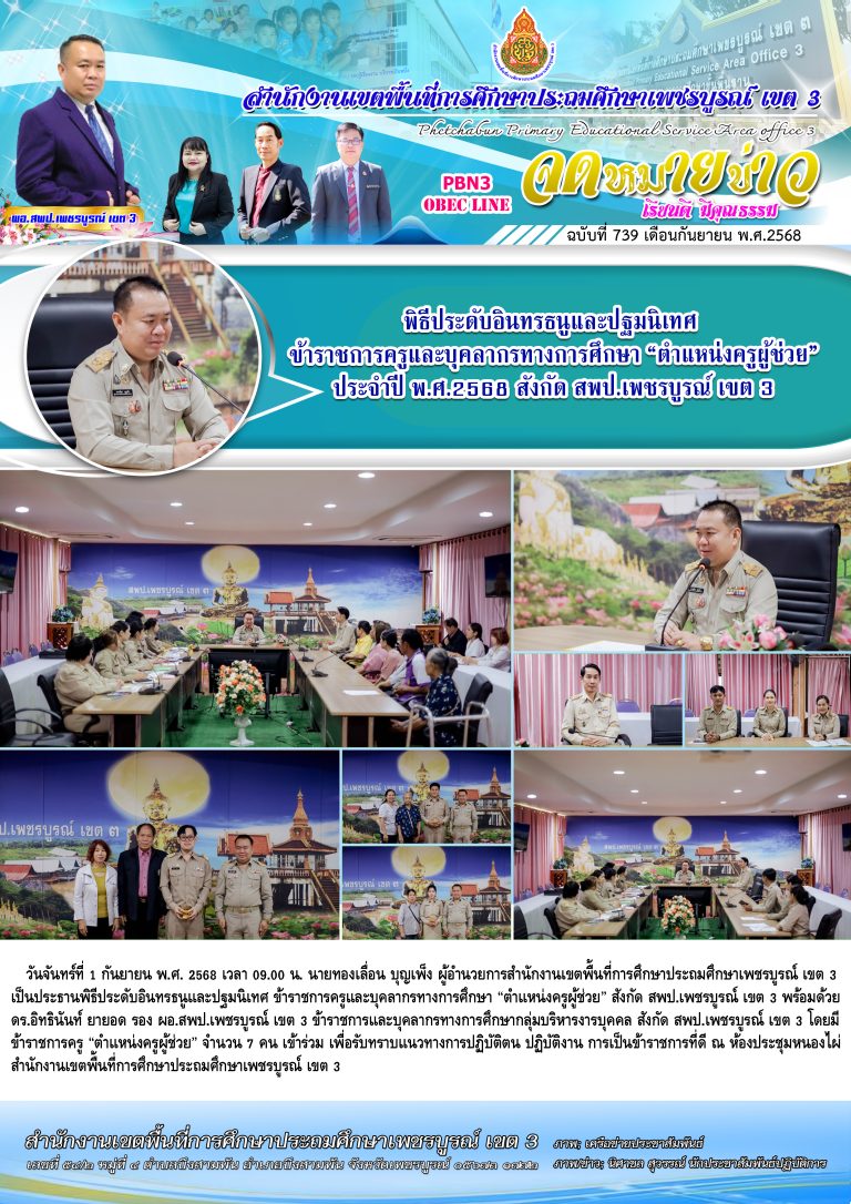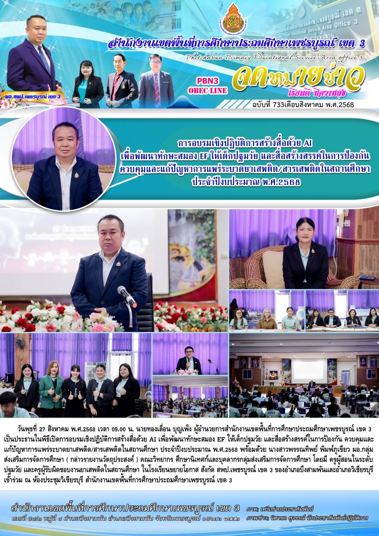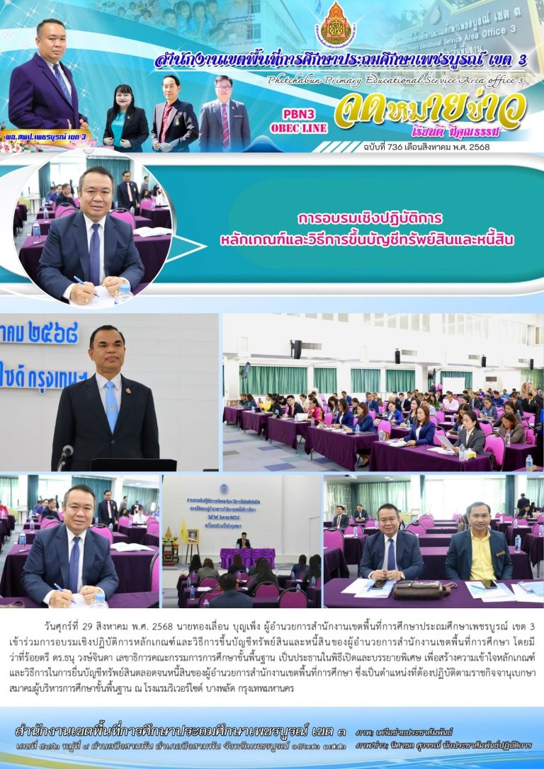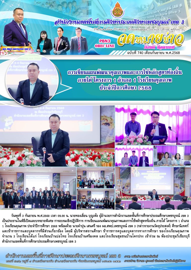 วันพุธที่ 3 กันยายน พ.ศ.2568 เวลา 09.00 น. นายทองเลื่อน บุญเพ็ง ผู้อำนวยการสำนักงานเขตพื้นที่การศึกษาประถมศึกษาเพชรบูรณ์ เขต 3 เป็นประธานในพิธีเปิดและบรรยายพิเศษ การอบรมเชิงปฏิบัติการ การเขียนแผนพัฒนาคุณภาพและการใช้หลักสูตรท้องถิ่น ภายใต้ โครงการ 1 อำเภอ 1 โรงเรียนคุณภาพ ประจำปีการศึกษา 2568 พร้อมด้วย นายคำปุน เสนศรี รอง ผอ.สพป.เพชรบูรณ์ เขต 3 (กล่าวรายงานวัตถุประสงค์) ศึกษานิเทศก์ และข้าราชการและ