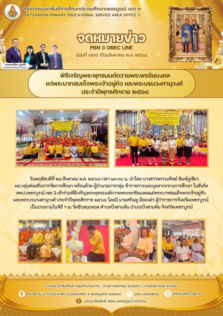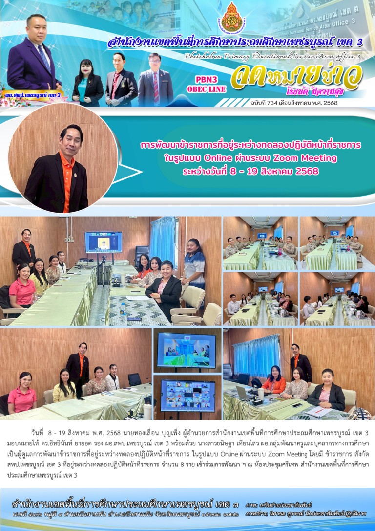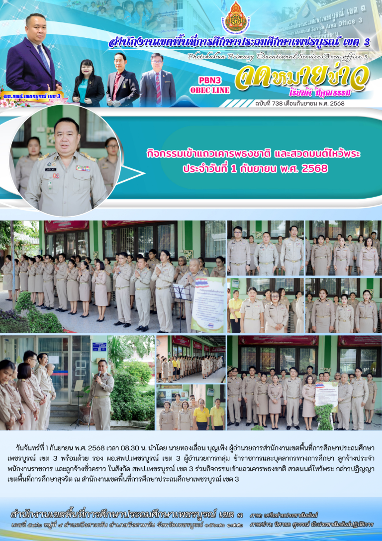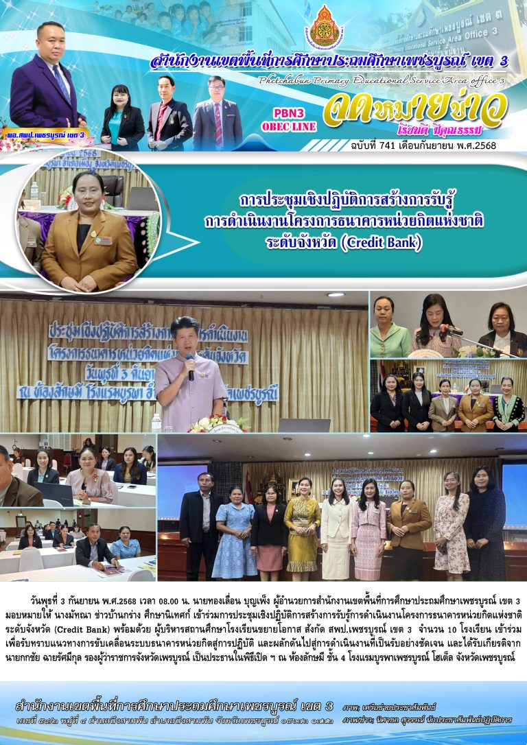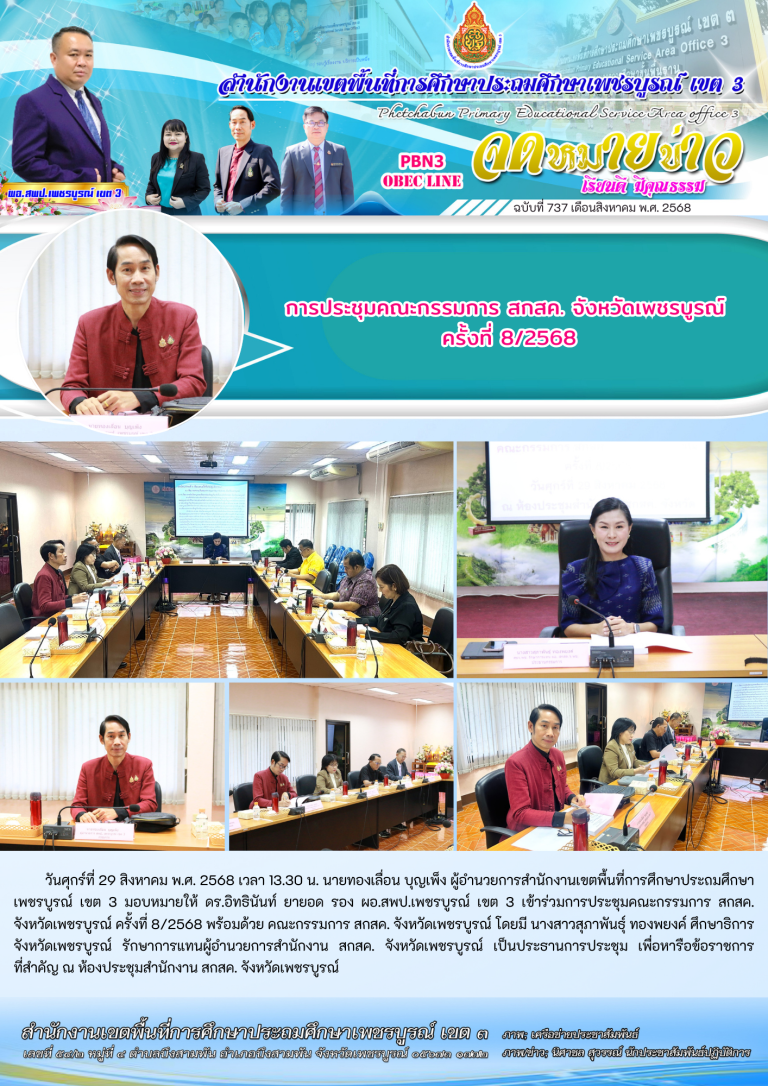 วันพุธที่ 3 กันยายน พ.ศ.2568 เวลา 09.00 น. นายทองเลื่อน บุญเพ็ง ผู้อำนวยการสำนักงานเขตพื้นที่การศึกษาประถมศึกษาเพชรบูรณ์ เขต 3 เป็นประธานในพิธีเปิดและบรรยายพิเศษ การอบรมเชิงปฏิบัติการ การเขียนแผนพัฒนาคุณภาพและการใช้หลักสูตรท้องถิ่น ภายใต้ โครงการ 1 อำเภอ 1 โรงเรียนคุณภาพ ประจำปีการศึกษา 2568 พร้อมด้วย นายคำปุน เสนศรี รอง ผอ.สพป.เพชรบูรณ์ เขต 3 (กล่าวรายงานวัตถุประสงค์) ศึกษานิเทศก์ และข้าราชการและ