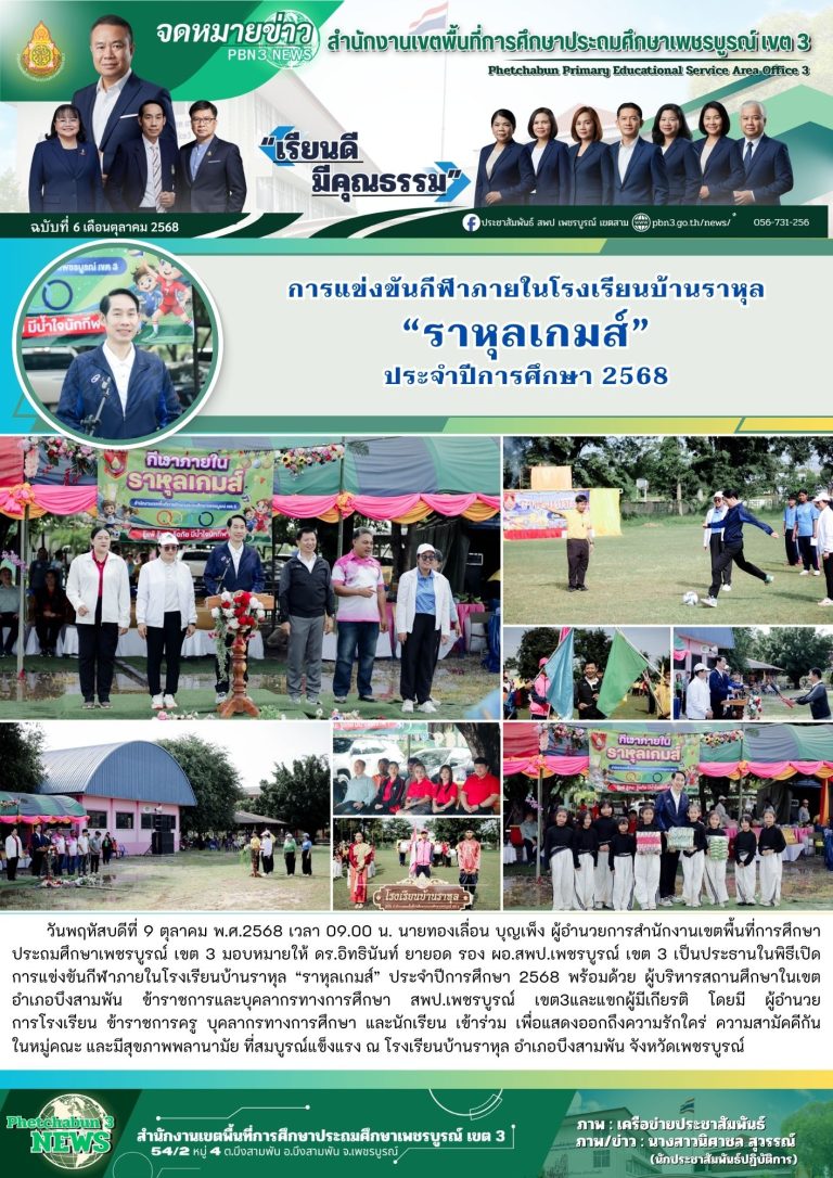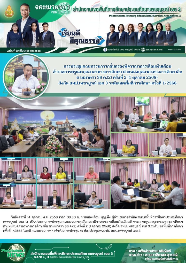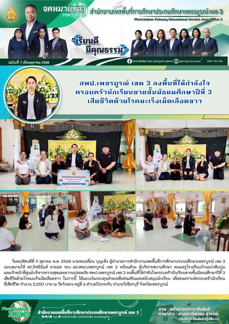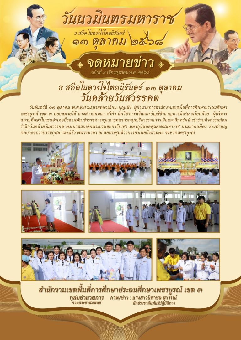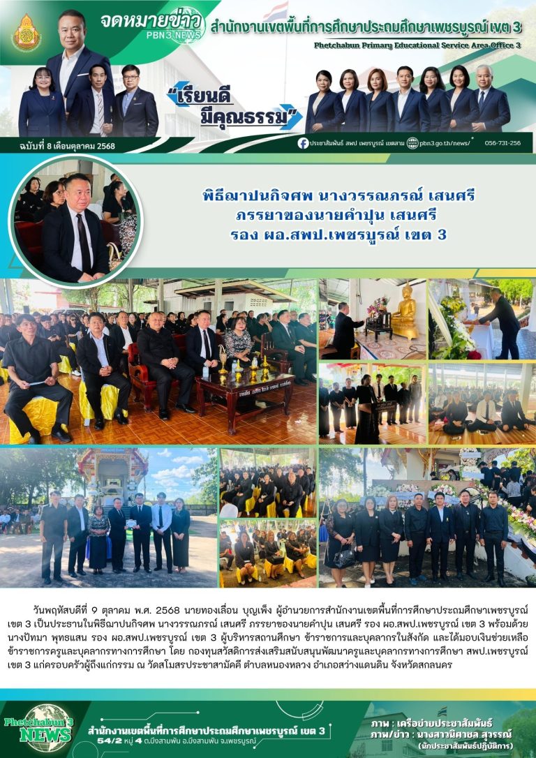 วันจันทร์ที่ 13 ตุลาคม พ.ศ. 2568 นายทองเลื่อน บุญเพ็ง ผู้อำนวยการสำนักงานเขตพื้นที่การศึกษาประถมศึกษาเพชรบูรณ์ เขต 3 มอบหมายให้ นางสาวนันทนา ศรีคำ นักวิชาการเงินและบัญชีชำนาญการพิเศษ พร้อมด้วย ผู้บริหารสถานศึกษาในเขตอำเภอบึงสามพัน ข้าราชการครูและบุคลากรกลุ่มบริหารงานการเงินและสินทรัพย์ เข้าร่วมกิจกรรมน้อมรำลึกวันคล้ายวันสวรรคตพระบาทสมเด็จพระบรมชนกาธิเบศร มหาภูมิพลอดุลยเดชมหาราช บรมนาถบพิตร ร่วมทำบ